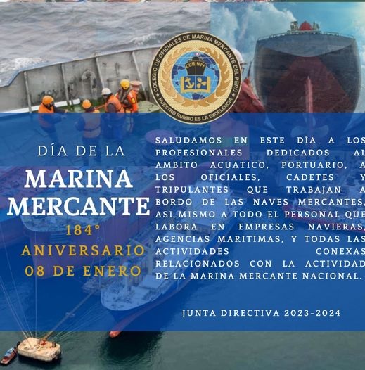 Saludamos en este día a los profesionales dedicados al ámbito acuático, portuario, a los oficiales, cadetes y tripulantes que trabajan a bordo de las naves mercantes, así mismo a todo el personal que labora en empresas navieras, agencias marítimas, y todas las actividades conexas relacionados con la actividad de la marina mercante nacional.